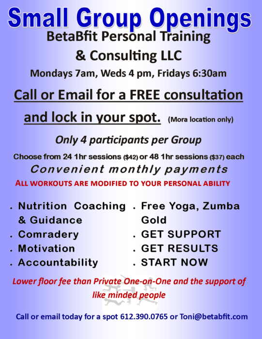 New opening in Small Group Training Posted on May 18, 2017May 18, 2017 by Toni Fulton Don’t miss this!! Share with your friends...FacebookPinterestTwitterGoogleLinkedinPrintEmailShare this:Click to share on Twitter (Opens in new window)Click to share on Facebook (Opens in new window) Posted in Fitness.