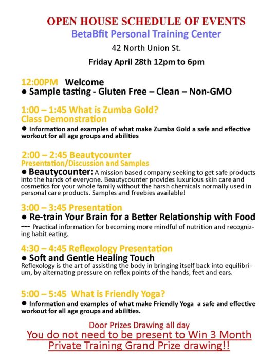 Open House Friday April 28! Posted on April 18, 2017April 18, 2017 by Toni Fulton Share with your friends...FacebookPinterestTwitterGoogleLinkedinPrintEmail Posted in Fitness.
